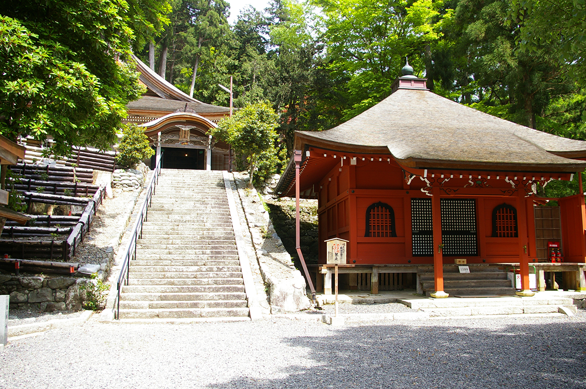 村を襲った大量の土砂は安曇川の流れを堰き止めて天然ダムを造り、新たな災害を発生させました。崩れた土砂は安曇川の流れを完全に堰き止め、湛水面積48万㎡にも及ぶ、巨大な天然ダムを出現させたのです。これにより隣村の坊村は集落の大部分が水没しました。『明王院文書』によると、葛川明王院の境内まで水位が達し、坊村の屋敷などが残らず流失したと記されています。地元の言い伝えによると、明王院の本堂(重要文化財)の石段が下から三段目まで水没したとされます(写真1)。