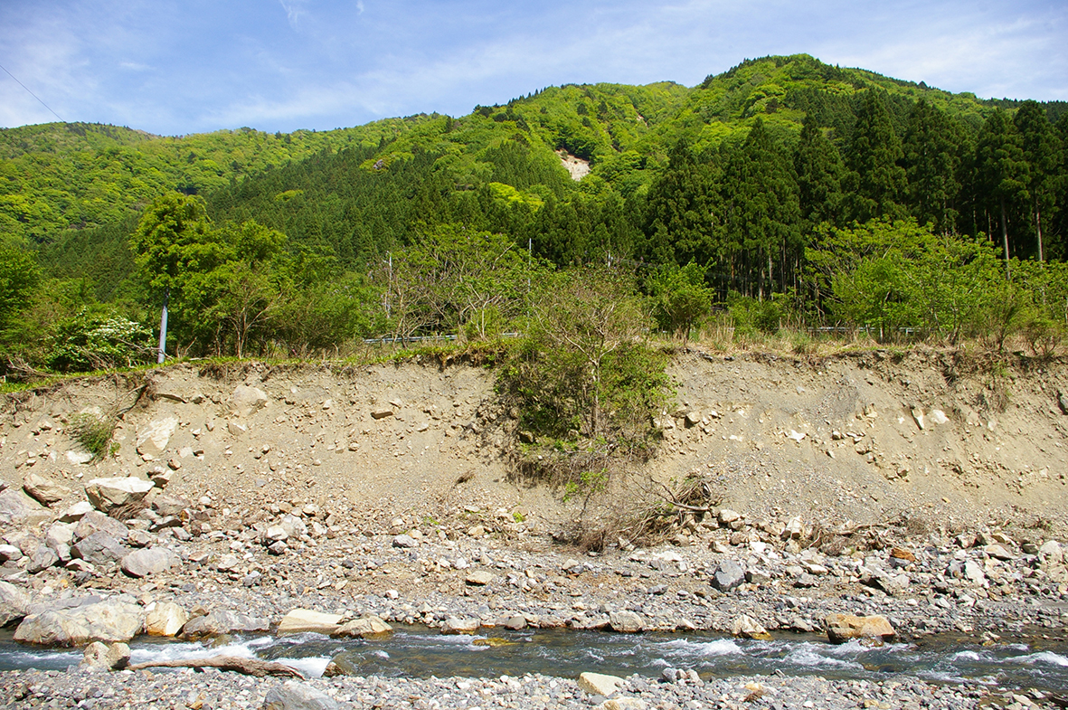 写真3 「天然ダム」の痕跡(正面の丘が崩壊した土砂によって形成された天然ダムの一部)