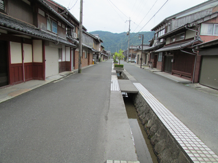 こういった水路は福島県の大内宿にも見られます。建物から少し離れた路上に2条が配されている例があり,あたかも車道と歩道を区切る分離帯のようにも見えます。これらは,江戸時代の町屋の一つの形態を示しています。戦国時代の京都が克明に描写された『洛中洛外図屏風』(上杉本)にも,建物から少し離れたところに幅の広い水路が描かれていて,大内宿との関連性を考えさせられます。また,形は少し違いますが,岐阜県飛騨古川や山口県津和野などでも,建物側に寄り添って幅の広い水路が存在します。これも主に生活用水や防火用水に利用されたと考えられます。このような都市・宿場・城下町等に見られる水路から,当時の人々の水との関わり方を示すものといえそうです。