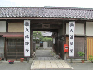 ◆大溝陣屋 分部氏は,三の丸に陣屋を構えました。一帯の地図を観察すると,高島駅の北方あたりに,東西方向に細長い地形が残っています。ここが陣屋の跡地であると想定されています。跡地の中には前後を道路で挟まれ,左右に細長い建物が付属した長屋門が残されており,「総門」と呼ばれています(写真2)。この長屋門は,武家屋敷の正門としての格式をもつ門です。この門は近年まで住宅として利用されていましたが,高島市が買い上げ,市の有形文化財として保存されています。