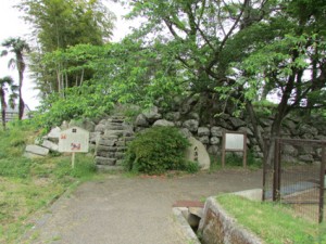 残念ながら,本丸や二の丸が埋められてしまったため,その痕跡は今ではほとんど確認できませんが,水田の中に方形に組まれた石垣が少し崩れていますが残っています(写真1)。これが天守台です。内湖を望める好位置にあることから,琵琶湖の水運を監視していた城であると考えられます。