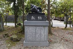 出庭神社の境内へ入ると、タニシをかたどったオブジェと説明文が記された石造物があります。それによると、出庭神社の神様の使いは「タニシ」であり、当地ではタニシを畏れ敬い食べることも禁止されてきたとのことです。