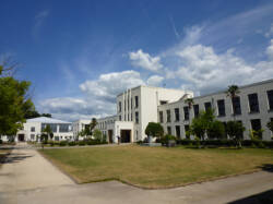 旧豊郷小学校では校舎や構内の酬徳記念図書館、講堂も登録されています。昭和12年(1937年)に建てられた建物で、平成25年(2013年)に登録されました。旧中山道に面した場所に建てられた、鉄筋コンクリート造2階建、建築面積1,879㎡、中央部を3階建の塔屋として正面に車寄を持つ、モダニズムを基調とした左右対称の威風堂々とした外観です。