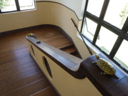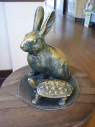 外観もさることながら、ぜひ見ておきたいものが構内の階段の手すりに施された「ウサギとカメ」の彫刻です。小学校ですから当然、実際に小学生がこの建物で生活していたわけですが、その小学生に向けて、有名なイソップ童話の説話が示すカメのように「こつこつと努力して成功してほしい」という古川鉄治郎氏とヴォーリズの願いがこめられたものと言われています。その造られた経緯についても感銘を受けますが、単純に階段の手すりのウサギとカメの彫刻はどこかユーモラスで、親しみやすい素敵な造形です。小学校といえば近年、姿を消しつつある二宮金次郎像が「このように育ってほしい」と願いを体現する造形の定番でしたが、この「ウサギとカメ」は、意匠としても小学校の階段の手すりにマッチしているうえ、出資者をはじめとした地域の人の願いまで込められていて、その発想にはただただ感服するばかりです。