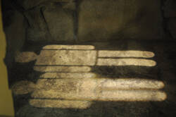 この石室の模型は自由に中に入ってもらえるものです。被葬者の位置に人の形の照明の演出をしています。石室内の照明が明るいとよくわかりませんが(写真2)、照明が暗くなると、その人の形の部分がはっきりとわかります(写真3)。照明の明暗のリズムは約10秒で、中に入れば、明るくなったり暗くなったりを体験でき、足元の人の形に気づかれるお客さんは多いと思います。ところが、石室の壁を見ている時や、大勢で入ると、足元の人の形に気づかないこともあります。さて、小学生たちは、触れるものは触りますし、入れるなら入ります。もちろん皆こぞって、模型の中に入っていきます。