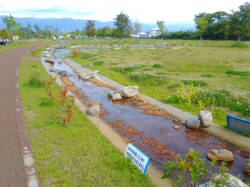 私が注目したのは「ai彩ひろば」の中にはよく見ると、「井戸水を利用しています」と書かれている浅い水路です(写真2)。この水路の中には水が湧き出ているところがあります(写真3)。私は、これは天井川の伏流水であり、廃川となっても僅かながら水脈が生きているのでは…と考えています。