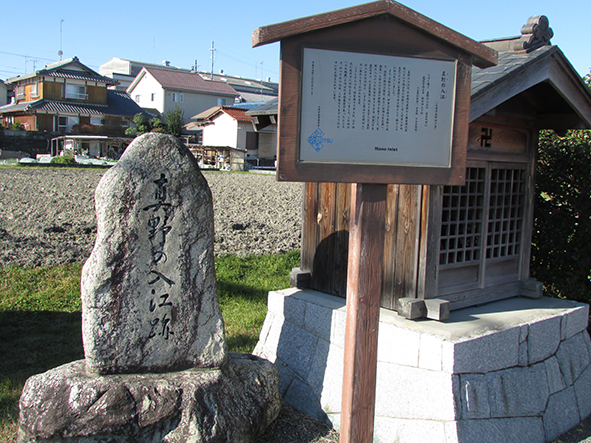真野の入江は、古来和歌にもよく詠まれているようで、平安時代の歌人源俊頼が、「鶉鳴く真野の入江の浜風に尾花波よる秋の夕暮れ」と詠んだように、多くの歌が詠まれていた場所でした。江戸時代には、この入江も埋め立てられたようで碑はその跡地と思われるところに建てられています。