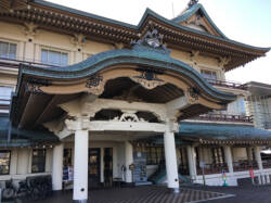 建物の外観は、桃山様式と呼ばれる和風のデザインで社寺建築をモデルとしたものです。建物正面の玄関を覆う大きな屋根は緩やかに曲線を描く唐破風となっており、外観の中でも特に目を引きます。この屋根を含むすべての屋根は、緑青色をした銅板に覆われています。銅が酸化し錆びることで現れるこの色は、新しく葺きなおされるときにあえて慣れ親しまれた雰囲気を失わないように科学処理をして再現されたものです(写真2)。