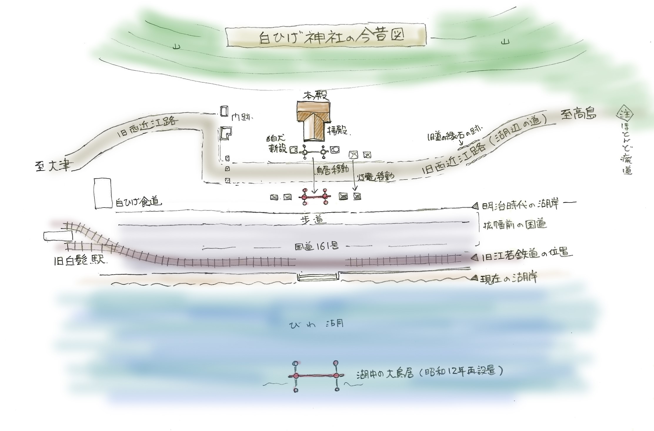 案内図1 白鬚神社今昔図 (作図:ヨコタヨウゾウ)
