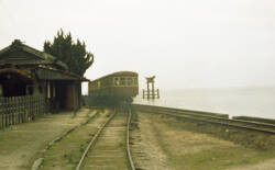 写真3 江若鉄道白髭駅の駅舎前を走る列車(左端の唐破風の建物が駅舎)