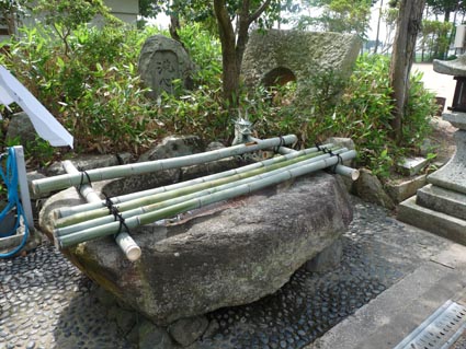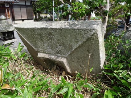 まず、下物町の天満宮境内には付近から出土した花摘寺廃寺の礎石が多く集められています。手水鉢に転用されているのは、長径1.8mもある大型のもので、塔の心柱を支える礎石(塔心礎)なのでしょう。(写真1)また、この横に屋根のような形をした石造物があります(写真2)。これは露盤と呼ばれるもので、塔の最上部に使われる部品です。一辺1.8mで中央に心柱の上端を挿入するための直径60cmの孔があけられています。孔から四隅に向けて美しい稜が掘り出された優品です。このような重量物を地上数十メートルの塔のてっぺんに据え付けていたのですから、当時の技術力には驚かされます。