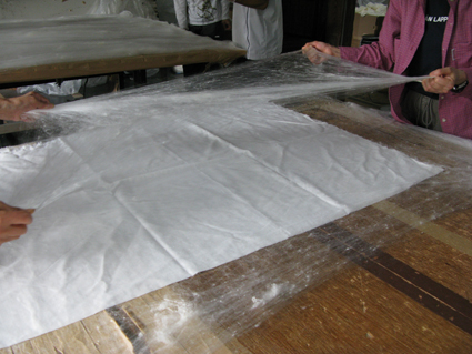 奥さんの作業を見ていると簡単そうでした。でも、ほんのちょっとやらせてもらっただけですが、なんだかとても難しく、ちっとも上手くできません。とりあえず、数個やってみただけですが、炊いた繭の独特のにおい、中の蛹のにおいを実感しました。手に付いたにおいは後までなかなか消えませんし、なにより均等にうまい具合にのばせないのです。糸が切れそうでこわごわやってました。奥さんは「大丈夫、糸はちゃんとつながってる。薄いところや穴が開いたようになってもちゃんとつながってるから破れない」と諭してくださいますが、これもかなり大変な作業だと痛感しました。まず、どこから繭を開いたらいいかもよく分からないし、個々の繭によって扱い方が違うのです。