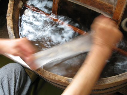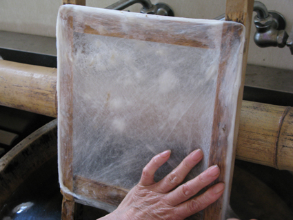 つぎに、この角真綿を繭から作るところを是非見たいと奥さんにお願いすると、炊いて冷凍してある(最近は冷凍してあるらしい)繭で、繭むきを実演してくださいました。ぬるま湯を張った木のたらいに繭を浮かべます。水の中で繭を開き(写真2)、中の蛹を出して、ぎゅっぎゅっとのばしながら(写真3)、左手の母指以外の指に掛けます。同様の作業を繭5個分くらい繰り返します。これを、今度はたらいに立てかけた下馬という桧製の木枠に引っかけて四角くのばします(写真4)。この繭5個分ほどで一手がけ、その一手がけを4枚重ねて角真綿一枚になります。