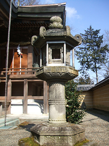 境内には、国の重要文化財に指定されている鎌倉時代の石燈籠があります(写真4)。高さが230.6mを測る花崗岩製で、平面六角形をしたものです。火袋には銘文があり、その中には「延暦四年」(1311年)と刻まれています。「全容的につりあいのよい、すっきりとした鎌倉時代の名作」と紹介されている石燈籠を見学してはいかがでしょうか。