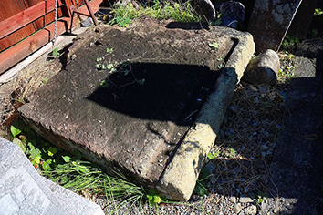 集落内の瑞正寺と正眼寺の境内には、赤塚古墳から出土したと伝わる兵庫県の加古川流域産の竜山石(凝灰岩)製組合せ式家形石棺の部材が置かれています。ただし、そうとは知らずいるととおり過ぎてしまいますが。両者ともに赤塚古墳の石室の年代観と矛盾しないため、もとは赤塚古墳に納められていたと考えられます。