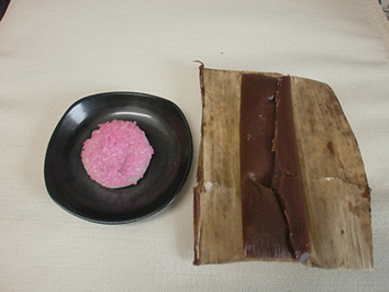 いが饅頭(写真3:左)は、その形が栗の毬(いが)に似ていることから名づけられたお菓子で、漉し餡を団子生地で包んで、もち米をまぶしてあります。「でっち羊羹」(写真3:右)はでっちや行儀見習いの人が奉公先への土産にしたと伝えられるお菓子で、小豆餡と小麦粉を練り混ぜて竹の皮で包み、蒸しあげて作られています。どちらも控えめな甘さで、何個でも食べられます。
