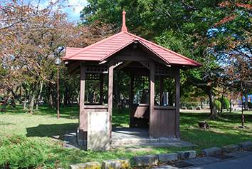 ここでもう1つ長浜の近代建築を紹介します。長浜駅にほど近い湖岸縁に安土桃山時代に羽柴秀吉が築いた長浜城がかつてありました。現在その跡地は豊公園として市民の憩いの場になっているとともに、多くの観光客でにぎわっています。その公園内に1棟の四阿(あずまや)があります。よく目にする公園の四阿とは異なり、どこかモダンな感じを醸し出しています。この四阿に取り付けられた説明版によると、1918年(大正7年)に市内に開設されたスポーツ公園に設置されたもので、昭和初期に現在の地に移設されたということです。このような歴史ある四阿ですが、現在でも普通に休憩場所として機能しています。私も近くで発掘調査をしていた時に、ここでお昼のお弁当をひろげたりもしました。(内田保之)