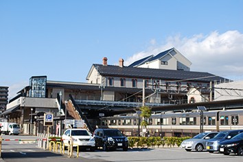 【公共交通機関】旧長浜駅舎はJR長浜駅西口より徒歩3分、豊公園はJR長浜駅西口より徒歩5分