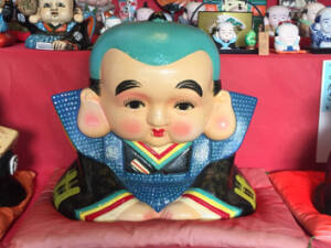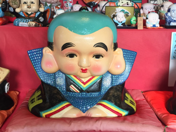 『木曽街道六十九次』には「亀屋左京」の店内に、テョンマゲに裃姿で正座する大きな福助人形が描かれています。幸福、長寿、商売繁盛のシンボルとして知られる福助人形のモデルは、農家の息子、京都の呉服屋主人、そして亀屋の番頭と、諸説あります。亀屋の番頭は常に裃を付けて扇子を手放さず、道行く客を手招きし、どんなに少なくとも艾を買う客に対してはいつも感謝の心を表して、おべっかを言わず、真心で応え続けたため、客の信頼も厚く、商売も大繁盛したため、主人に重用され、伏見の人形屋がつくったものが店舗に置かれるようになったといわれています。最近ではあまりみかけなくなりましたが、“昔、家に福助の貯金箱あったなぁ”、という方も多いのではないでしょうか。