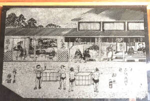 近江(江州)の商人が天秤棒に商い品をかついで各地に赴き商売し、成功して大棚の主となった者も多いというのはよく知られています。伊吹艾を江戸で売り、大成功した柏原の六代目・亀谷左京七兵衛にはある秘策がありました。まず、儲けた財を遊郭・江戸の吉原で惜しみなく使い、お大尽として有名になります。そして遊女に、この歌を事あるごとに歌うよう頼んだといわれています。当時、吉原は流行の最先端、文化の発祥・伝達の場でした。この単純で覚えやすい歌は瞬く間に江戸に広がり、さらに商品が売れたようです。七兵衛はこの元祖コマーシャルソングを考案し、商品を宣伝・販売しただけでなく、柏原の店舗に付設して近江八景を取り入れた大がかりな庭園をつくり、行き交う人に開放し、もてなすことで、旅人が国もとに帰った時に亀屋左京のことが話題に出るようにもなりました。また、上方で伊吹艾を題材にした浄瑠璃を演じさせたりと、伊吹艾の広報に工夫を凝らし、商才に長けた人物だったようです。