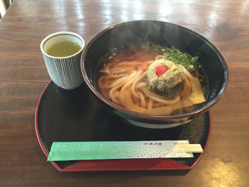 “伊吹堂”の斜め向かいには「柏原宿歴史資料館」があります。資料館は亀屋七兵衛の伯父さんである亀屋久作左京宅を改装したもので、中山道「柏原宿」を中心とした、地域の歴史について学ぶことができます。数十体の福助人形が出迎えてくれる部屋もあり、制作時期や趣向の異なる福助人形をみることができます。また、付設する「喫茶 柏」では、「やいとうどん」を食べることができます。「やいと」とは灸(きゅう)、艾のこと。火のついた艾に見立てて、こんもり盛られた“もくず”の上に紅生姜が乗っており、その下に半分に切ったゆで玉子が隠れています。ほかにも、かつお節、結び湯葉、ネギが添えられています。どんなお味か、お試しあれ。