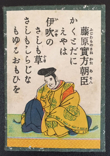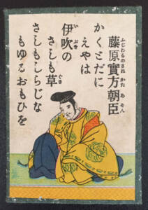 この「艾」と「伊吹山」については、こんな歌が知られます。「かくとだに えやは伊吹のさしもくさ さしも知らじな もゆる思ひを」(こんなにあなたを想っていることすら言えずにいます。伊吹山の“さしもくさ(ヨモギの別名)”のように燃えている私の思いを、あなたはおわかりにはならないでしょう)。百人一首第五十一番でも馴染みの歌で、もともと『後拾遺集』にみられるこの和歌は、平安時代中頃の藤原実方が詠んだ恋の歌として知られており、「伊吹」で採れる「さしもくさ」が読み込まれています。実方は歌才に優れ、清少納言をはじめ多くの女性とも交流があり、光源氏のモデルのひとりともいわれていますが、陸奥国(東北地方)に異動になり、かの地で生涯を閉じます。