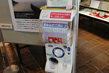工作の材料としてご用意しています。お代は400円!子供たちが大好きな【ガチャガチャ】で買うところもミソです。磨く前の勾玉の石1個、便利な紙やすり3種類、首にかけるためのヒモ1本、そして勾玉とその製作手順についての解説書つきです。縄文時代からの歴史がある勾玉について勉強しながら、自分だけのオリジナル・アクセサリーを作ってみてください!会期中、毎日買えます。