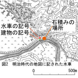 図1 石積みの場所 図2 明治時代の地図に記された水車