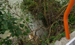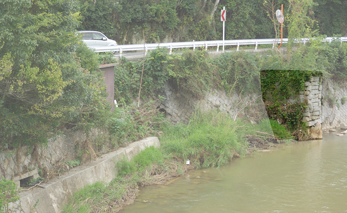 しかし、なぜこの場所に頑丈な石積を築く必要があったのでしょうか。一帯の護岸石積を含めて、石積にコンクリートを使用しない「空積(からづみ)」という古い作り方で築かれていることから、明治から大正時代ごろに造られたと」考えられます。このときは、それ以上のことはわからなかったので、「昔に何らかの目的で造られたもの」という軽い気持ちで写真を撮って帰りました。