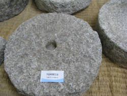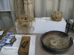 【展示室2】は「伊吹山の恵みとなりわい」のテーマで、石材や植物など山がもたらす恵みを活用したなりわいについて、各種民俗資料が展示されています。例えば、良質な花崗岩でつくる「石臼づくり」では作りかけの石臼(写真1)や製作道具の数々、ヨモギから作る「もぐさ」では製造に使う石臼、唐箕(とうみ)など。「麻織り」については原料・加工過程の繊維や糸から製品(着物)まで(写真2)。また湖北地域でかつて盛んだった「養蚕」に関する設備や道具、あるいは真綿(まわた)づくりの道具類と現物資料。山の資源の一つ、木材からつくる「木炭」については原料木材の各種標本が展示されるなど、多彩ななりわいが紹介されています。