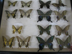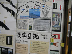 2階には【展示室3・4】の常設展示室が2カ所があり、企画展示や、講座などが催されています。【展示室3】は「伊吹山の自然と文化」をテーマに、岩石・化石・植物・昆虫・動物・鳥類などの豊かな自然について、標本(写真3)・剥製・カラー写真などを用いた説明と、それら自然と人々のくらしとの結びつき、山の恵みに対する「いのり」として今も受け継がれる「まつり」なども紹介しています。そして近代化へのあゆみについては、伊吹山でとれる様々な石灰石のサンプルをはじめ、日本の戦後復興を支えた伊吹山のセメント産業について、その歴史や製造工程なども紹介されています。また、この部屋の自然分野と人文分野の境には、カーテンのように吊り下げてある、ポスター展示や壁紙新聞のような手書き・手作りの展示パネルがあり、「食文化」「川魚の利用」「薬草史」「おこない」など細かなテーマごとにシートが分けられています。これらは一か所にまとめて吊り下げられているので、見たいものを引っ張り出して見るようにできており、わずかなスペースにいろんな情報が収納されたような感じです。