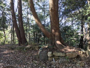 後円部の頂上に上ると、四角く石積みを施した塚が5基配置されています。これが大友皇子に最後まで付き従った皇子の子供と舎人達の「葬り塚(ほうむりづか)」で、中央に位置する大きな塚が大友皇子の墓(写真3)、右手奥の塚が大友皇子の子供-大友与多王(よたのおおきみ)の墓と伝えられています(写真4・5、古墳に建てられた解説板「葬り塚」:大津東ロータリークラブによる)。ちなみに、私が見学に訪れた際には、いずれの塚にもお花が供えてあり、いまもなお手厚くお祀りがされていることがわかりました。