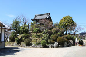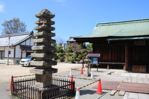 県道2号大津能登川長浜線に面した山門をくぐると、正面に重要文化財に指定されている銅板葺の本堂や石製の九重塔が見え、その左奥に鐘楼が見えます。