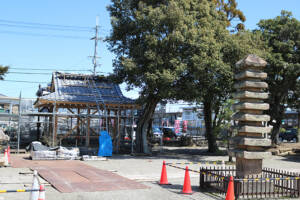 円光寺の境内にある大行事神社では、最近、道路の拡幅工事に合わせて、老朽化していた本殿の覆屋(おおいや)や基壇(きだん)の石垣が美しい姿に改修されました。私が見学に訪れた際には、拝殿の改修工事の最中でした(写真3)。久野部1号墳を見学の際には、こちらもぜひ見ていただきたいと思います。