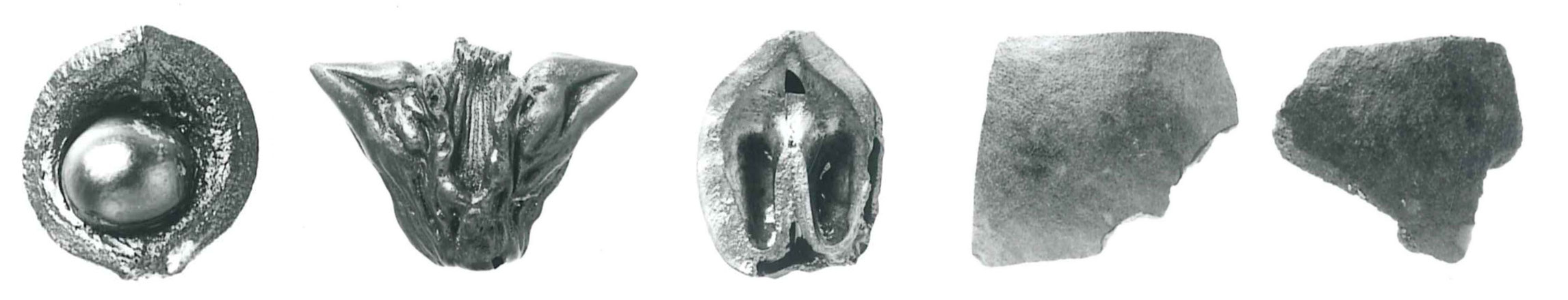 同定の結果、見つかった大型植物遺体は、トチノキ果実・ヒシ属果実・オニグルミ核・ヒョウタン仲間果実だということがわかりました。トチノキ果実は中に種子が入った状態で、ヒシ属果実はほぼ完形で、オニグルミ核は自然発芽をしたものと齧歯(げっし)類による食害痕があるもの、ヒョウタン仲間果実は外皮の一部が見つかっています。縄文時代から近世にかけて、食糧や容器として利用されてきたものですが、採取した試料には、まったく人が関わった痕跡がありませんでした。秋に実をつけるものばかりなので、秋になって周辺に生育していたものが落下し堆積したか、やや遠方から水流によって流されてきたものだと考えられます。