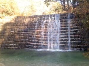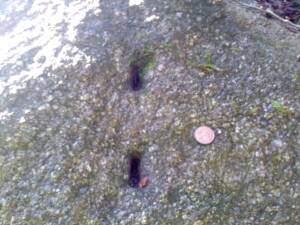 オランダ堰堤は幅34m・高さ7mで、花崗岩の切り石を階段状に積み上げて築かれています。現在でも川原の花崗岩の石に「矢穴」とよばれる石切りの痕跡(写真2)が残っていますので、石材は近場で調達したのかもしれません。堤の中は石灰を混ぜた赤土をたたき固めてあるとされています。堤を真上からみると上流側に向かって膨らむアーチ構造になっています。そのため、堤を越えて下流へ流れる水は堤の中心付近に集まります(写真3)。この構造が水の流れによる、堤の崩壊を防いでいると考えられています。このように、オランダ堰堤は明治時代から治水に重要な役割を果たしましたが、現在明治時代の姿をとどめる堰堤は少なく、歴史的に貴重なものであるといえます。