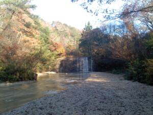 建築されてから130年あまり経過した現在も、花崗岩の切り石を積んだ堤は健在ですが、堤の上流側は砂で満たされています。完成当初、堤の上流側に砂はほとんどたまっていなかったと思われます。この砂が防災上重要なポイントです。金勝山は、おもに墓石などに使われる花崗岩でできた山です。花崗岩は風化しやすく、風化すると大量の砂が発生します。砂が下流へ流れると、川底にたまることで川底の高さが上昇し、増水時の堤防決壊の原因となります。とりわけ、金勝山では古くから樹木を伐採していて、伐採による地面の露出が砂の流出に拍車をかけました。その対応に苦慮した明治政府は砂防堰堤を築くとともに、山への樹木の植林事業を積極的に進めました。現在でも下流での水害を防ぐために、砂防堰堤は重要な役割をはたしているのです。