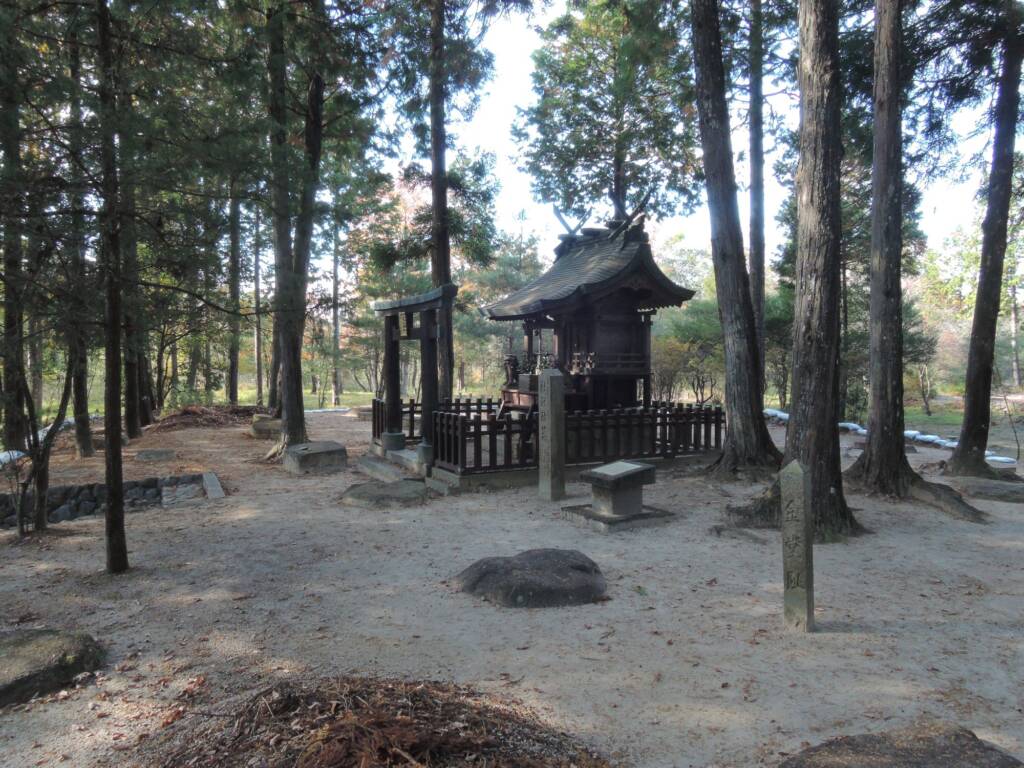 内裏野地区は大正15(1926)年の史跡指定ののち、昭和5(1930)年になって肥後和男らによって初めて発掘調査が実施されました。調査後は、昭和7(1932)年9月から同12(1937)年3月にかけて滋賀県による標識や木柵の設置、遺構保存用の置砂などの簡易な整備事業が行われています。社殿は、これらの整備事業が完了したのちに建てられたようです。