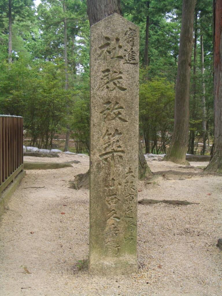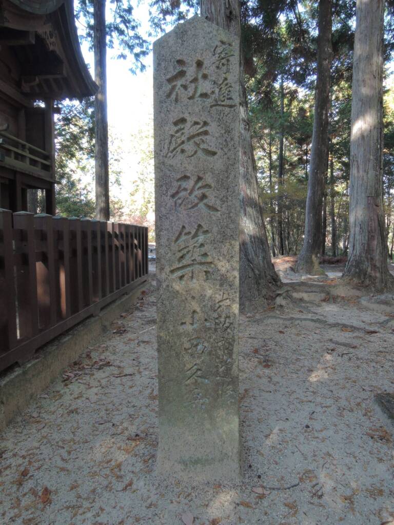 社殿脇の標柱には「寄進 社殿改築 大阪道修町 小西久兵衛」「昭和十二年五月」とそれぞれ刻まれていることから、この社殿が昭和12(1937)年に大阪道修町の小西久兵衛なる人物によって寄進されたことがわかります(写真3・4)。