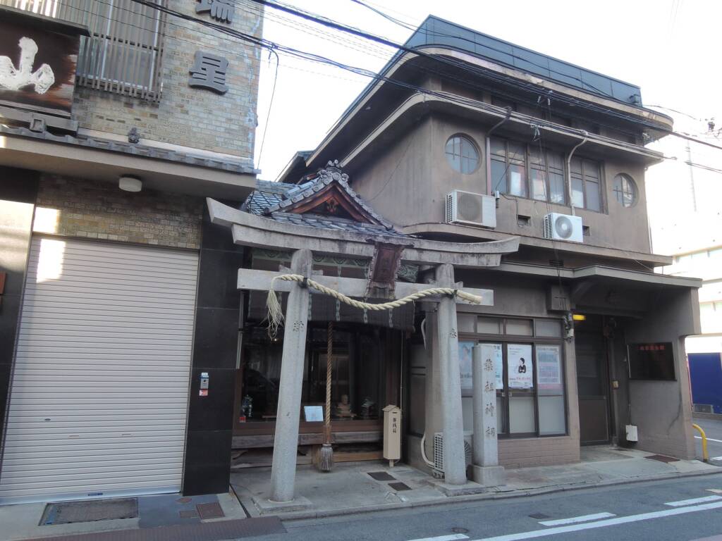 京都駅前を南北に抜ける烏丸通を二条まで行き、西に一筋目が両替町通。そのすぐ西側に現在は閉まっていますが、二条薬業会館という昭和モダンな2階建ての建物があります(閉業)。その建物と西側の薬局に挟まれたわずかな空間に薬祖神祠という小さな神社があります。祭神は大己貴命・少彦名命・神農・ヒポクラテス(!)という少し変わった神様の組合せですが、薬にちなんだ神様たちです。二条界隈は京都における薬種問屋街で、大阪の道修町のような役割を果たしており、小西久兵衛も商売上の付き合いがあったようで、その関係から別の場所にあった神社をこの場所に整備し直した際に、鳥居を寄進したようです。