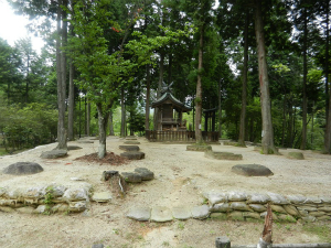 内裏野地区は大正15(1926)年の史跡指定ののち、昭和5(1930)年になって肥後和男らによって初めて発掘調査が実施されました。調査後は、昭和7(1932)年9月から同12(1937)年3月にかけて滋賀県による標識や木柵の設置、遺構保存用の置砂などの簡易な整備事業が行われています。社殿は、これらの整備事業が完了したのちに建てられたようです。