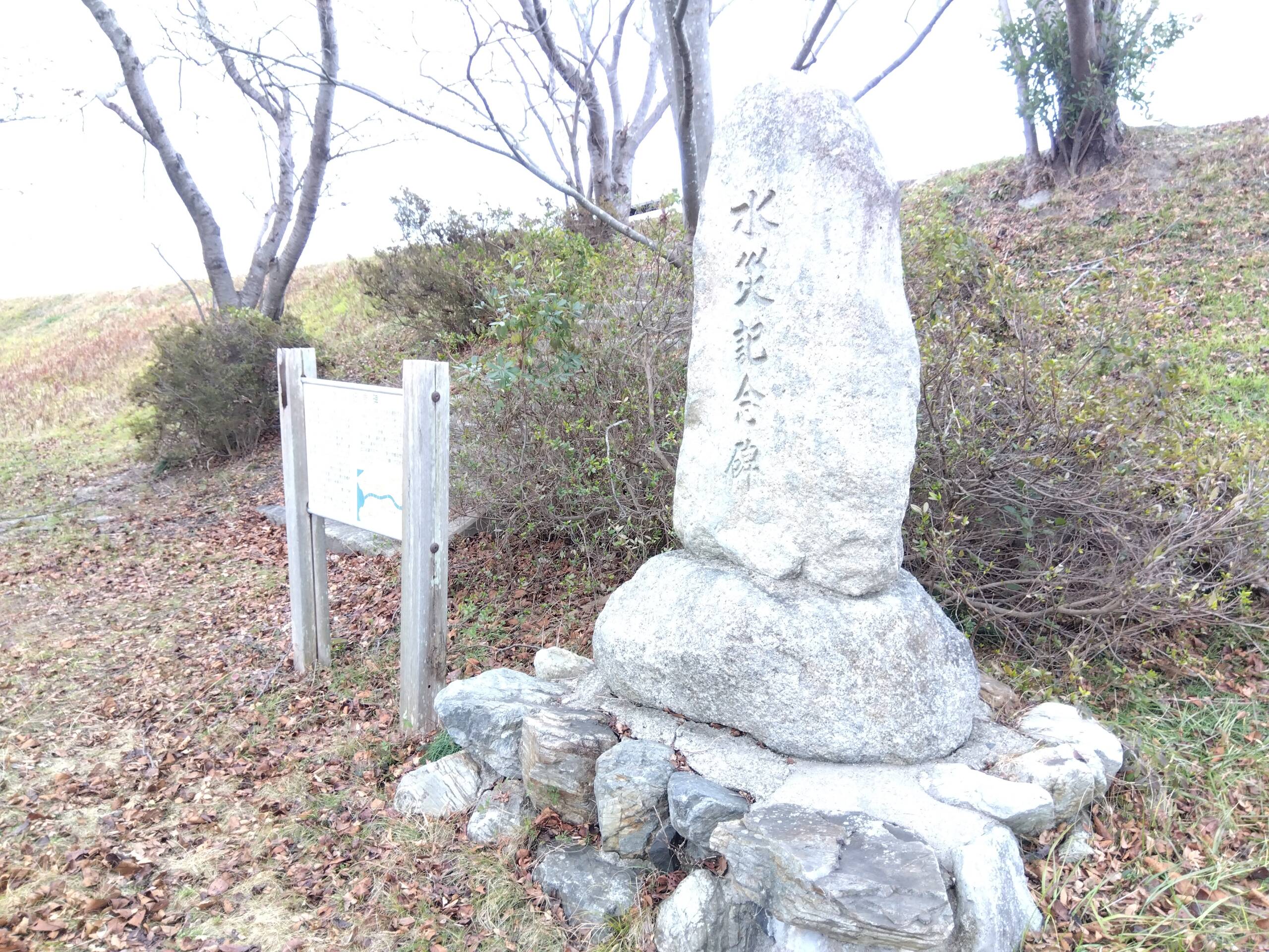 野洲川放水路の完成後も、北流と南流の堤防は部分的に残されています。写真①は、笠原町に残される南流の堤防です。旧堤防の内側には放水路堤防があります。同じ河川でありながら、二重の堤防がみられる不思議な景観です。写真②は旧堤防ですが、直線的な放水路堤防と異なり、アーチを描いています。写真③は、撮影地点から西へ少し行ったところにある水害記念碑です。記念碑のとなりには説明板があり、昭和の水害の様子が記されています。写真④は、旧堤防が放水路堤防から離れていく地点です。ここから南流堤防は南へ向かいます。河川堤防としての面影は薄くなっていますが、耕地や公園として利用されています。