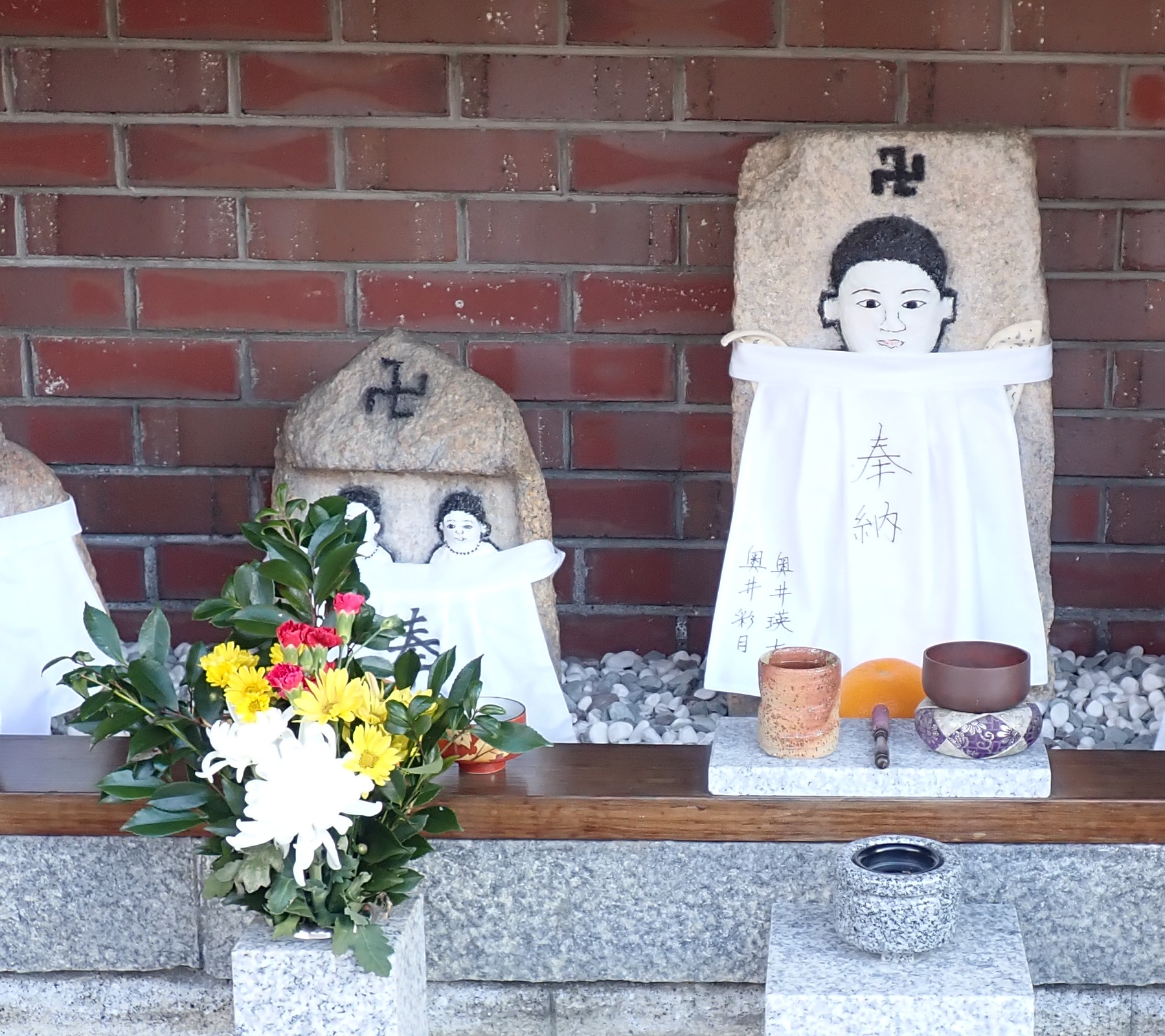 この悲劇を受け、地域の人々が作ったものが子守地蔵です。写真からもわかるように、真新しい前掛けがかけられたり掃除が行き届いていたり、子守地蔵が建てられてからおそらく100年以上経った現在も大切にされていることがわかります。