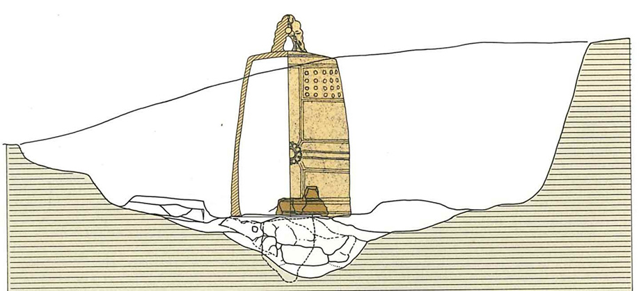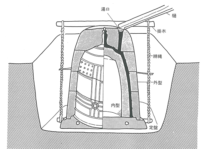 梵鐘とは、寺院などで使用される釣鐘(つりがね)のことです。梵鐘づくりの手順は、①地面を掘り窪め基礎を固める、②粘土で作成した中子(なかご)型に外型をかぶせる、③中子と外型のすきまに熱で溶かした青銅(せいどう)を注ぐ、④冷えるのを待って鋳型(いがた)から取り外す、⑤全体を磨いて仕上げる、という工程が想定されています(図1)。