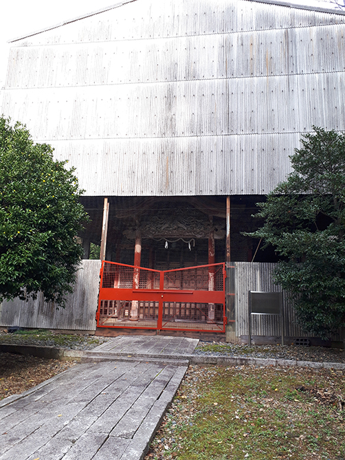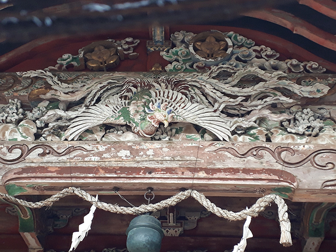 彦根市指定文化財である社殿は本殿と拝殿が相の間(あいのま)で結ばれる権現造(ごんげんづくり)と呼ばれる形式です。蟇股(かえるまた)や向拝(写真4)などは極彩色で彩られ、内部の天井板にも様々な草花がきらびやかに描かれています。建立された時期は新しめではありますが、江戸時代後期の高い技術をうかがうことができ、大名家による藩祖や始祖の顕彰のあり方を考える上で貴重な建造物だと言えます。この社殿は風化による痛みが激しいため、覆い屋がかけられており、普段は中を拝観することはできませんが、年に2回春と秋に特別公開が行われていますので、私も一度、拝観を希望してみたいと思います。