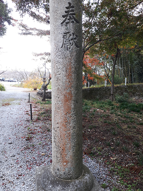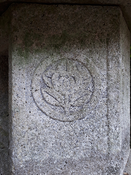 境内のいたるところに、この時の造営事業に伴って造られた石灯籠が見受けられ、鳥居(写真2)もこの時に建てられたことがわかります。石灯籠には井伊家家紋である橘紋や井桁紋があしらわれているのが観察できます(写真3)。