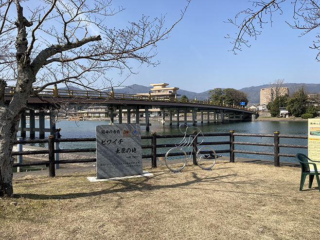 近年、「ビワイチ」というのがテレビなどでも頻繁に紹介されています。ご存じない方のために説明しますと、一言でいえば自転車で琵琶湖に沿って一周するというものです。このビワイチの起点が瀬田の唐橋の東詰にあるってご存じでした?(写真2)実際はどこからはじめてもよいのですが、ここに起点を設定したのは歴史的にみても地勢的にもやはりここなのでしょう。納得です。