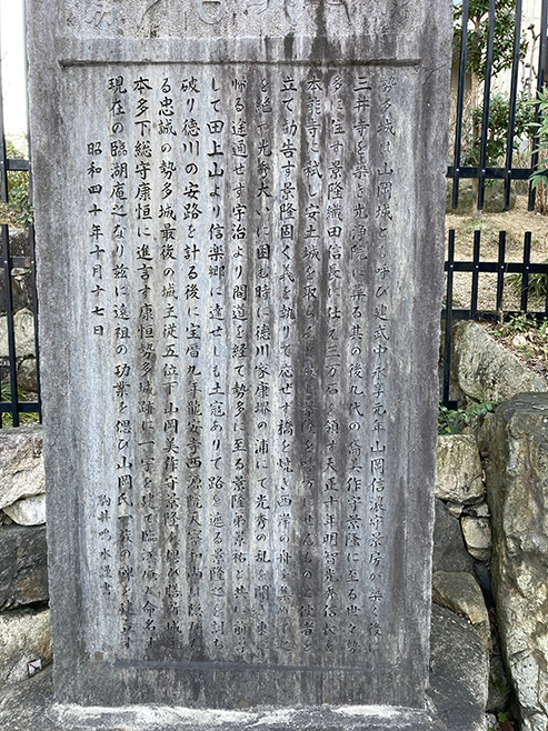 唐橋の東詰を少し南へ歩くと、マンションが建っています。この場所は勢多城があった場所とされ、本能寺の変の折、城主であった山岡景隆は明智光秀の誘いを断り、勢多橋を焼き落としたことが知られています。現在はその面影はなく、石碑が立っているのみです(写真3)。また、この付近には「市ノ辺」という小字地名があり、さきにあげた古代の市の推定地となっています。周辺の発掘調査では奈良時代から平安時代の建物などが確認され、多量の土器をはじめ和同開珎や官人が着用した革帯に付けた帯金具などが出土しているようです。