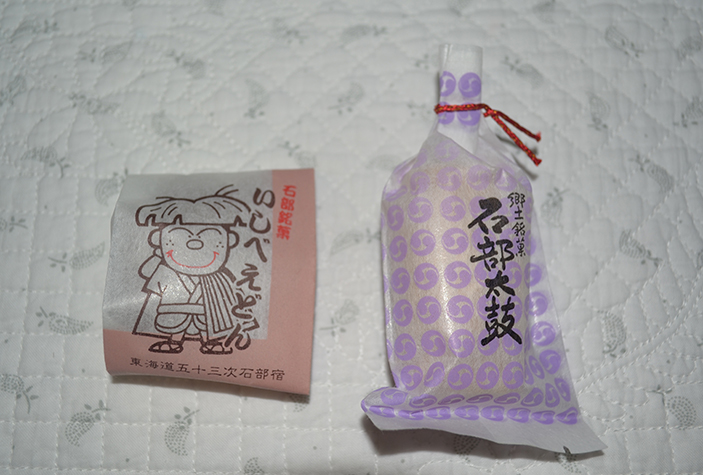 旧東海道沿いに、江戸時代から続く「谷口長栄堂」という和菓子店があります。今回は、石部宿のお土産用に作られた「石部太鼓」という最中(右側)と、「いしべえどん」というお饅頭(左側)を買ってみました。「石部太鼓」は、太鼓をかたどった小振りの最中で、中には粒あんが入っていました。1つ150円でした。最中の皮が香ばしくてとても美味しかったです。「いしべえどん」は、1つ140円でした。甘すぎないので、いくつでも食べられそうなお饅頭です。そのほかに、イチゴなどの果物を丸ごと包んだ大福が有名らしいです。