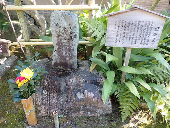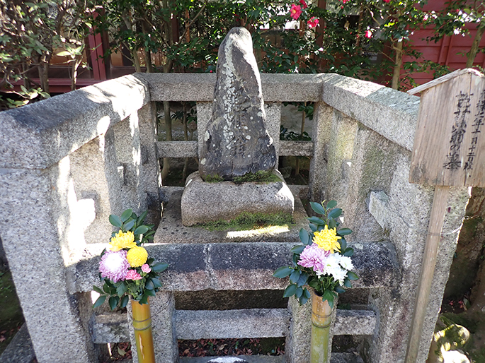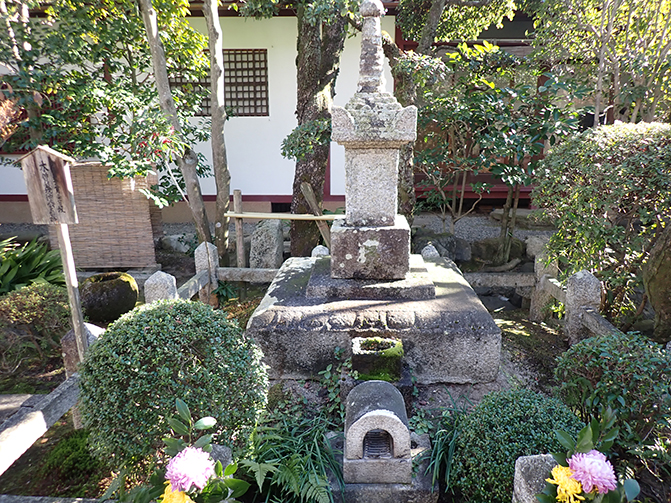 義仲の墓は、境内のほぼ中央に位置しています(写真1)。また、彼の墓の北隣に巴塚(巴御前を弔ったもの)、南隣に芭蕉の墓が建てられています(写真2・3)。墓の向かい側に位置する朝日堂は義仲寺の本堂であり、義仲・義高父子の木像がそれぞれ厨子に納められています。木像は普段見ることはできませんが、1月に義仲の法要が行われる際、公開されます。
